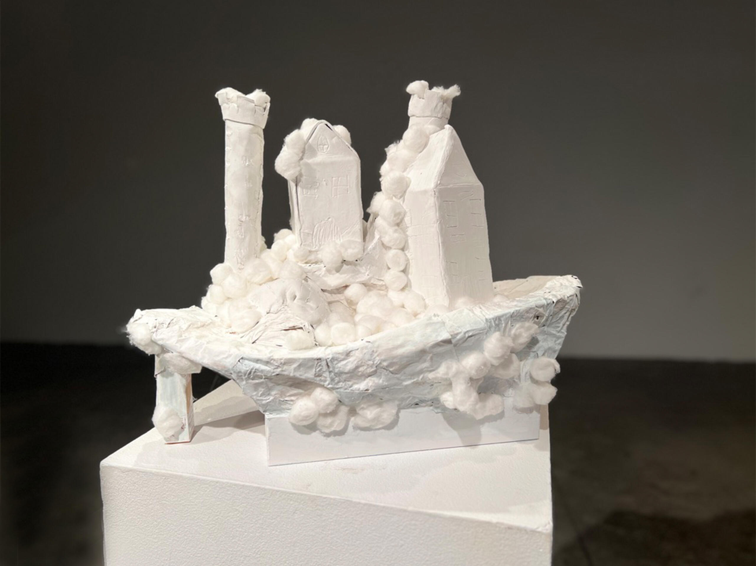 Paper mache, cardboard, Golden brand acrylic paint titanium white, cotton balls