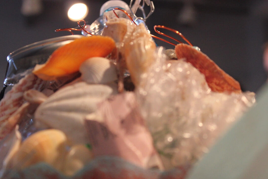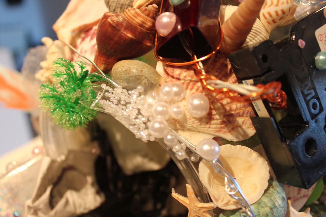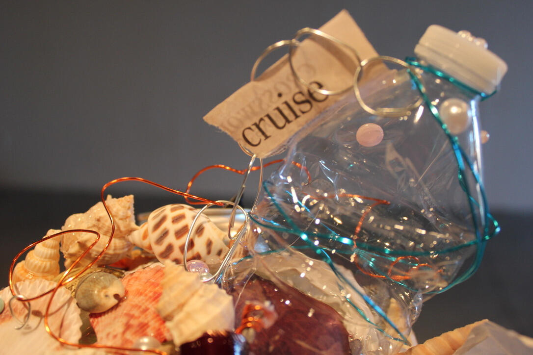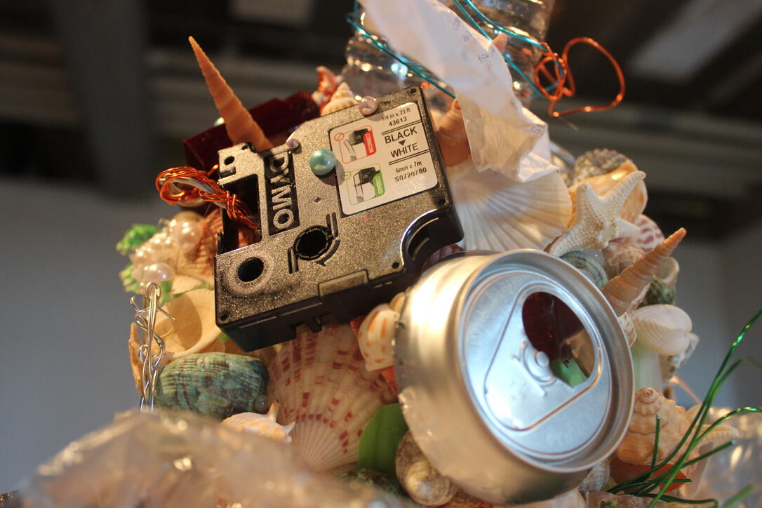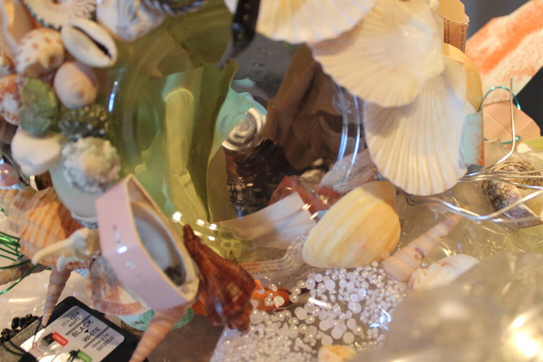 Found objects; includes shells, rubbish, pearls, bubble wrap, wire, fish bowl, and more