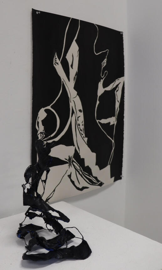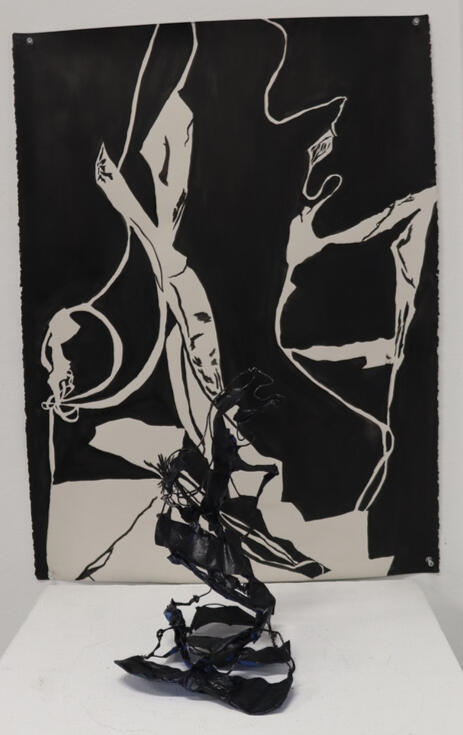 An abstract self-portrait with an accompanying bust. The bust is shaped roughly like a human heart, the bent lines representing pain and forms of heartbreak one might experience. The ink composition helps highlight additional detailing of the bust.